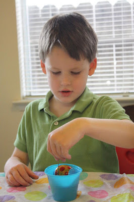 J told us several times this year that his tummy told him he could eat one egg full of candy, plus two more. Of course with him, the peeps went first. They've always been his favorite.