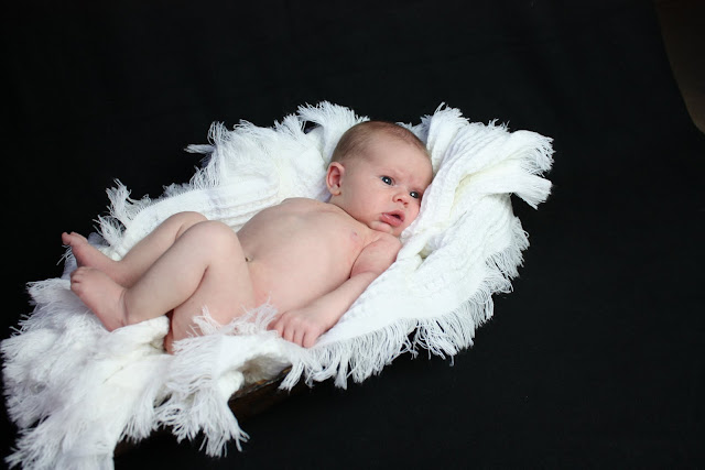 With baby B finally asleep in the trenchbowl, I tiptoed very slowly over to set her down in front of the cloth backdrop. Shaggy and the kids were all out of the house--no way I would have tried this with them all running around. I quietly crept over to the radio to turn it down so it would have no chance to wake her up. Then I secured the dog, so he wouldn't bark at a passing car and ruin my chance for the perfect photo. Then I knelt down ever so carefully in front of her and turned on my camera. I put it up to my face silently, finally ready to take my first shot.