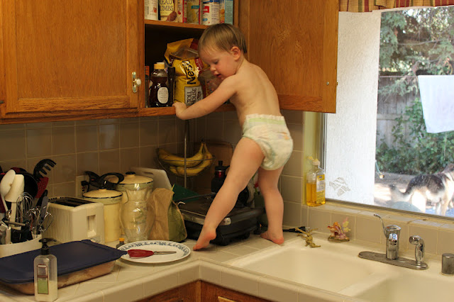 Here's a little visual tour that explains why I am rather looking forward to the fact that B will be strapped down for much of the next several weeks. And looking past the fact that she effortlessly got herself into every one of the following predicaments, let's also just ignore the plethora of hazards that surround her. Moving is such a messy (and hazard-filled) process. Helping her survive despite herself will be no small feat. I am grateful that she hasn't figured out how to entirely sqirm out of her carseat. Buckles are beautiful.