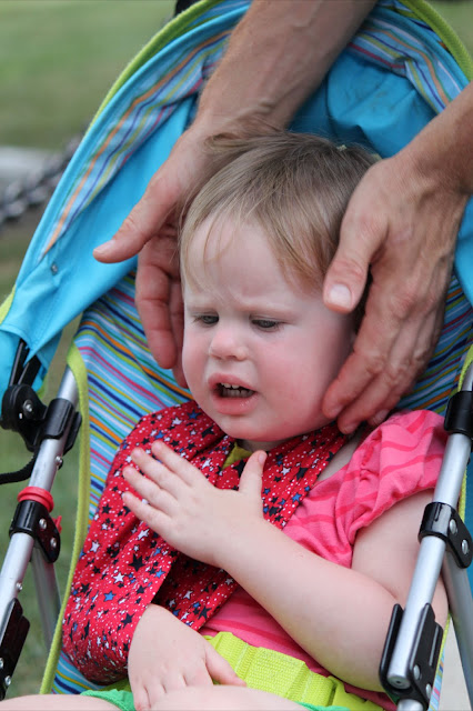 B's arm didn't seem to bother her much when it was kept still, so we pulled out the trusty bandanas that Aunt S had made for the family reunion (yep, that one that we bailed on). She was nice enough to send them with Grandma so we could pick them up on our way through Chicago. They were the perfect size for a toddler sling. And though we hated seeing her in any pain, we figured that her condition might actually work in our favor during sightseeing (veteran parent mindset, here). She wanted to stay in the stroller. She was content to avoid all of her regular shenanigans. If it was sprained, as we were beginning to suspect, there wouldn't really be any benefit from waiting all day in some ER or spending the day trying to find a doctor in the area. So we loaded up and headed out. B didn't like the jostling that it took to get in and out of her carseat, but once she was snugly buckled in, she was good to go, even if she was abnormally mellow.