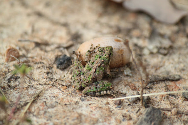 Some frogs are so small that they are easily mistaken for large grasshoppers or crickets, which we also see a lot of around here. So you always have to look closely at hopping things. That's a small acorn top in the background.