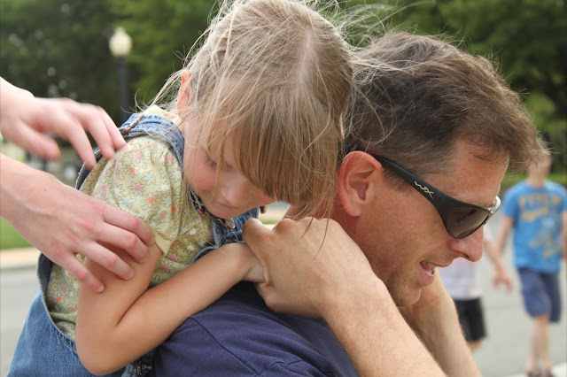 But he heard her crying (along with everyone else at the memorial), and came back. So after a big Daddy hug, all was well again.